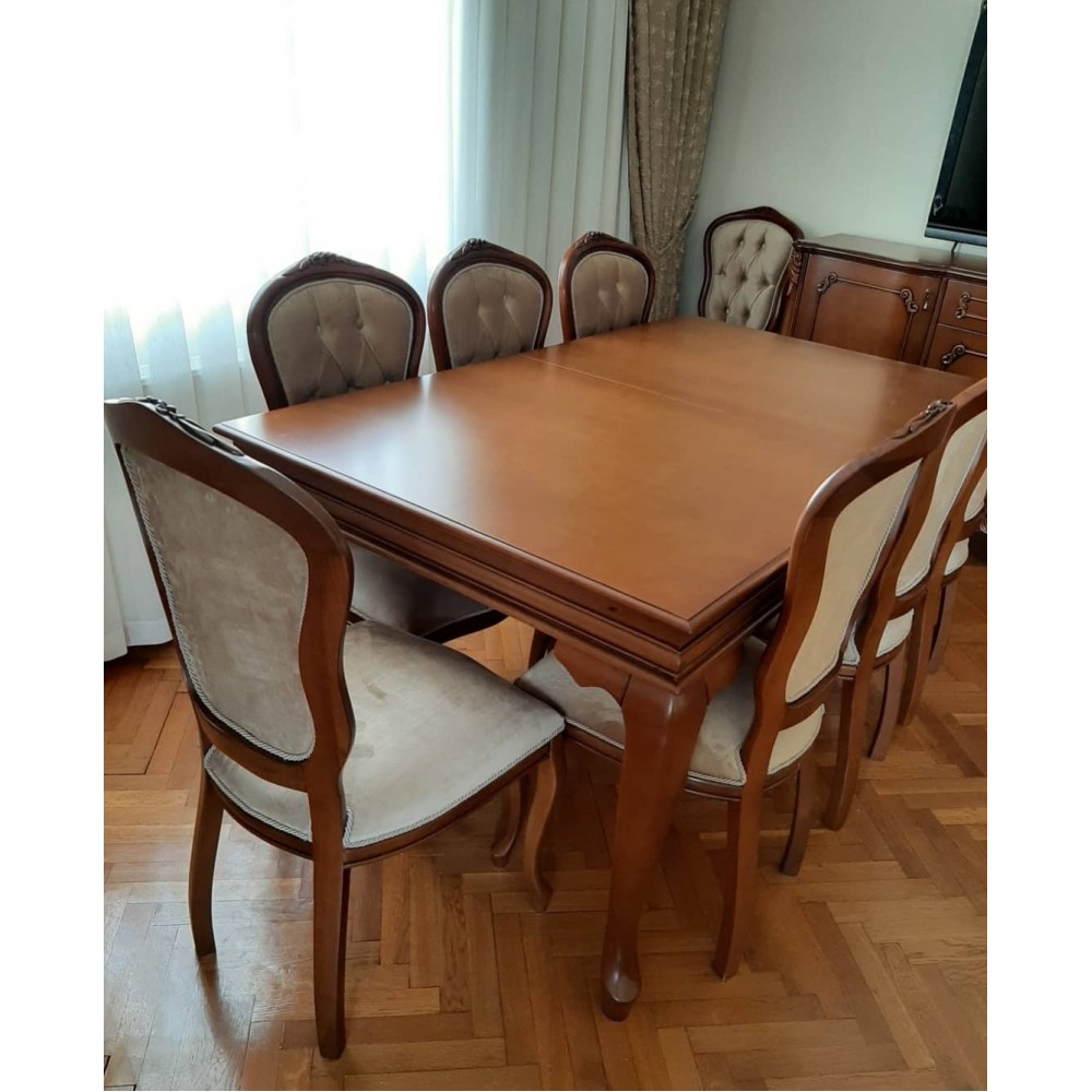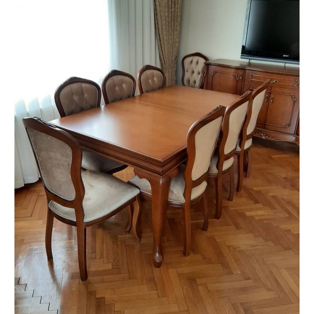 •Masa ve Sandalyeler Klasik Açık ceviz rengindedir kadife bej kapitoneli kumaş kaplıdır.