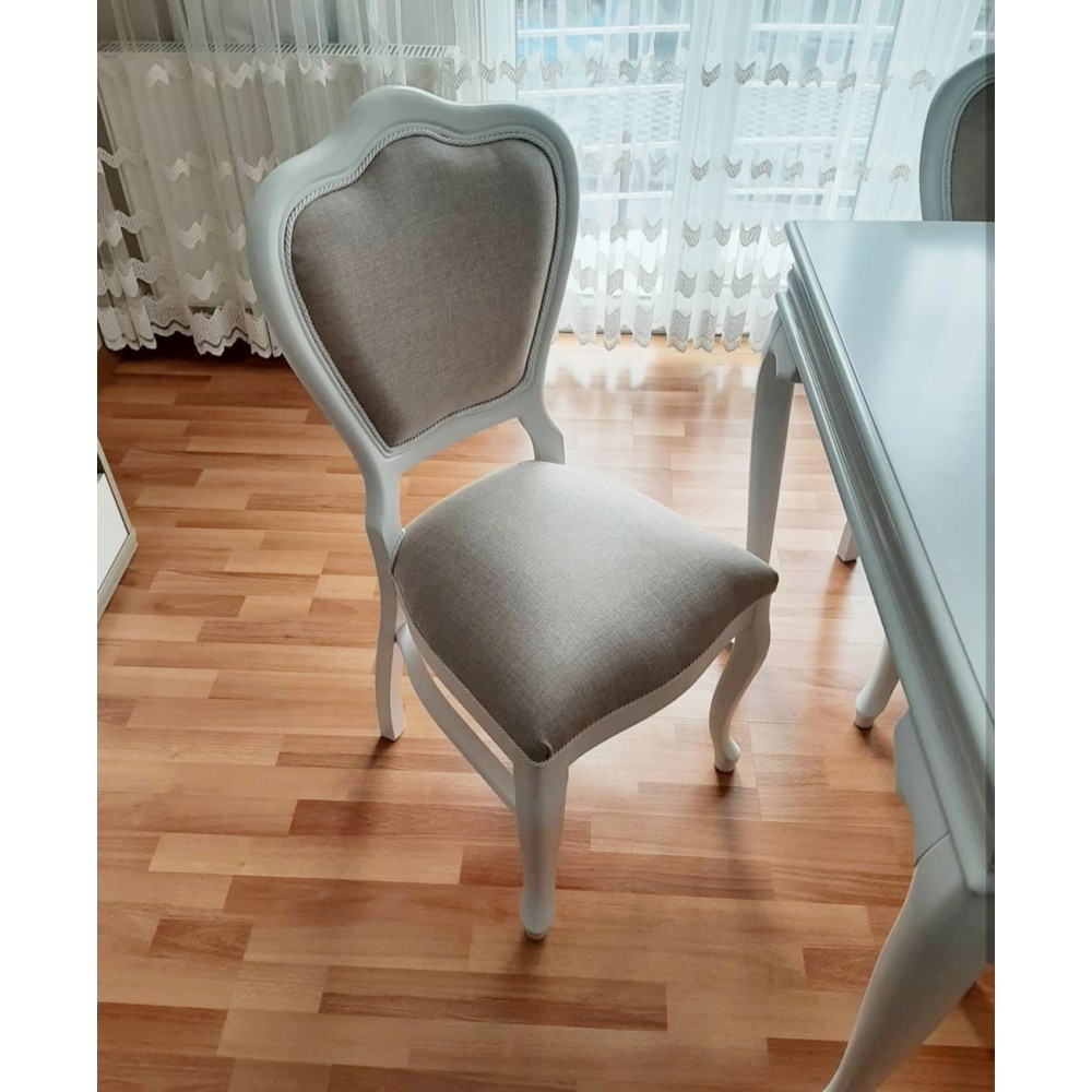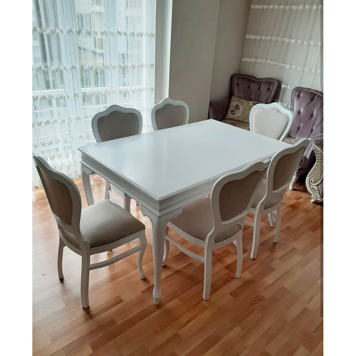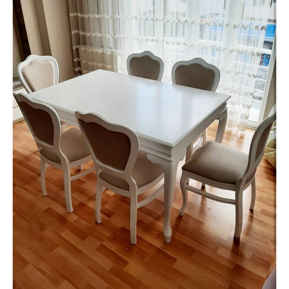 •Masa ve Sandalyeler Eskitme kırık beyaz rengindedir keten bej renk  kumaş kaplıdır.