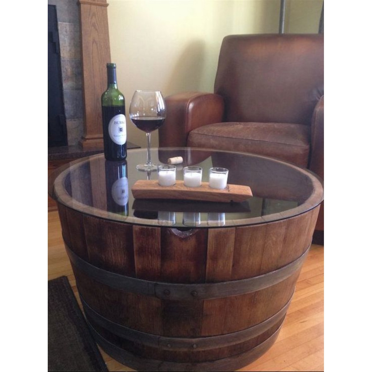 Masifart Şarap Fıçısı Yarım Camlı Yuvarlak Yan sehpa